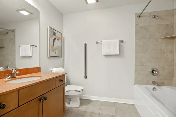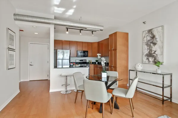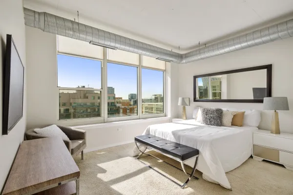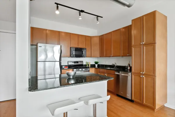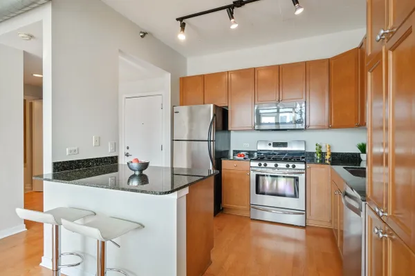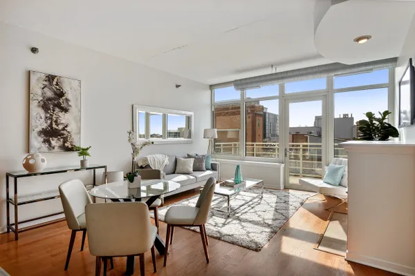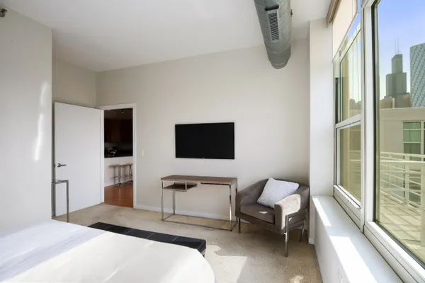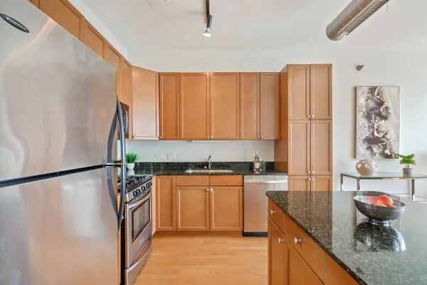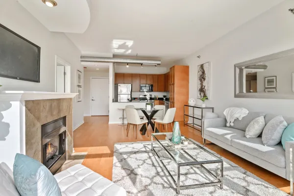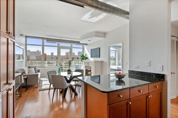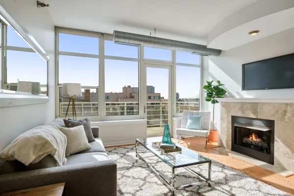 Stunning top-floor one bed / one bath condo in an amazing location steps to all things West Loop and Fulton Market. This unit features an open floor plan which is perfect for entertaining. The light-filled south facing unit has an expansive kitchen with 42" wood cabinets, granite countertops and stainless steel appliances. The inviting living space has a gas fireplace and easily accommodates both a living and dining furniture setup with a sizable balcony with jaw dropping skyline views. The large bedroom space fits a king or queen sized bed and has a walk-in closet with custom built-ins. Other unit features include hardwood floors in kitchen & living area, central heat/air and in-unit washer/dryer. This full amenity building offers a fitness center, community outdoor space and doorperson. Walk to everything in a prime West Loop location, close to the Randolph & Fulton restaurant row, Whole Foods & Mariano's, public transportation and all the shops on Randolph and Madison.