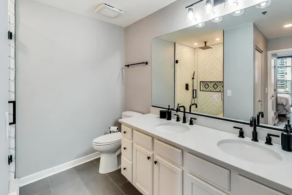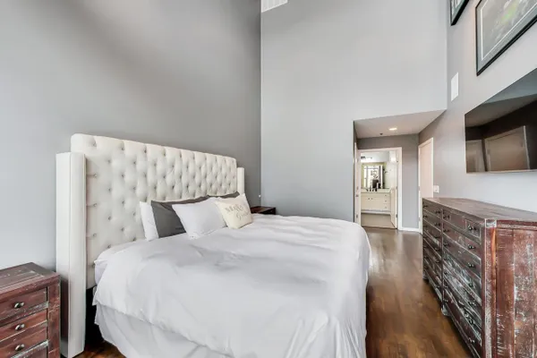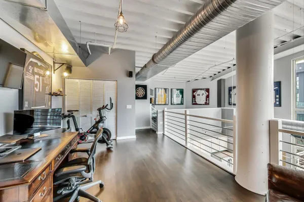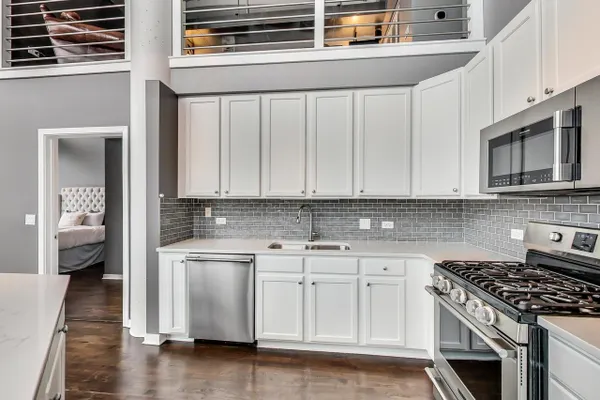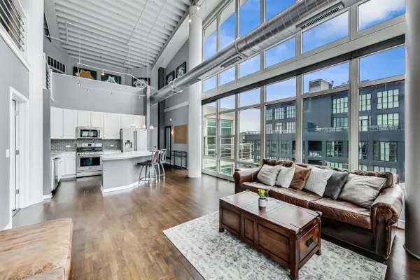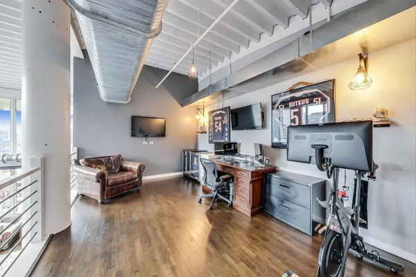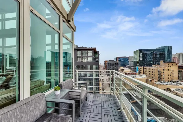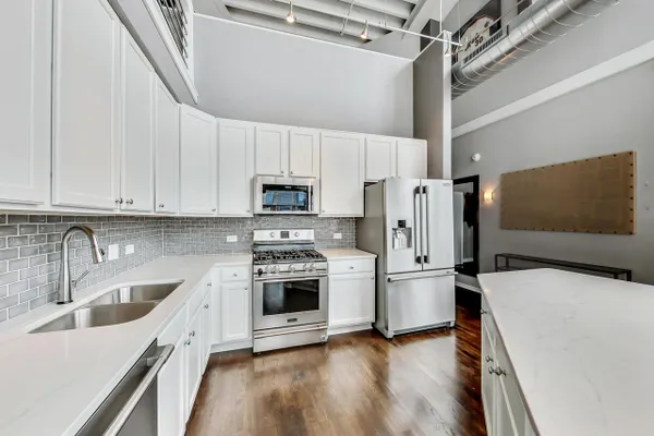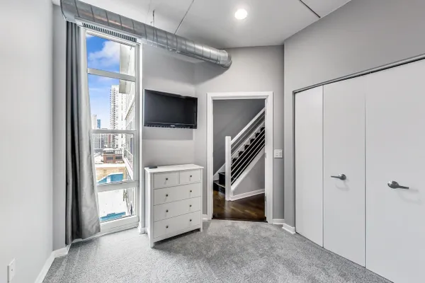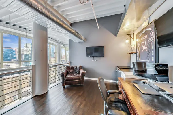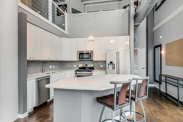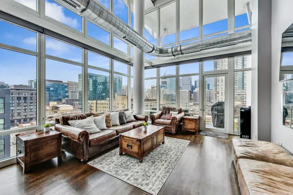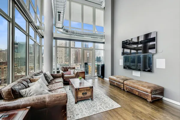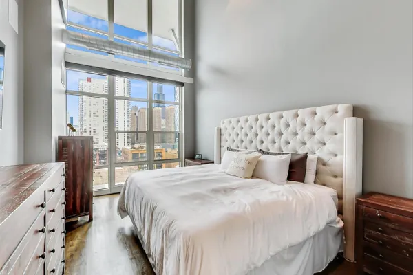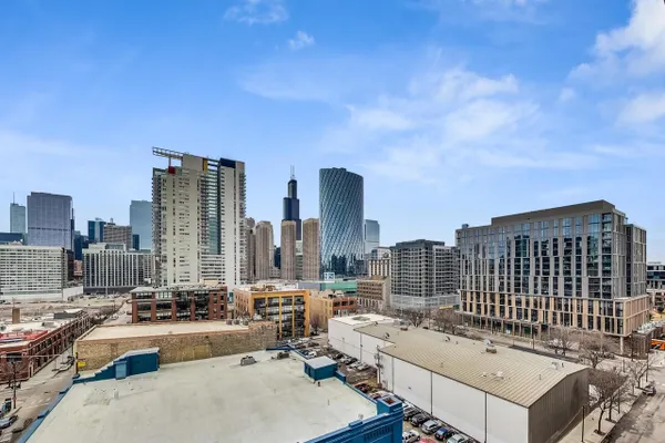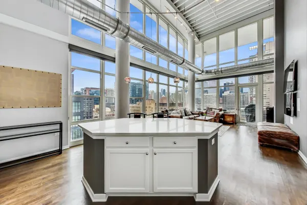 Penthouse In The West Loop With Sweeping Skyline Views and 23 Foot Floor To Ceiling Windows! You should see the views at night!! Beautiful 2 bed plus massive loft space which could be a 3rd bedroom. 1 of 2 penthouse units in the entire building. Brand new kitchen and bathrooms. Hardwood floors throughout. Primary suite has a walk in closet. Tons of storage. Close to L, expressway, restaurants and bars. Walk to Loop and the Fulton Market at your fingertips. Features custom surround sound system and lighting fixtures by Lightology. Full amenity building w/doorman and gym. Extra wide garage parking space included!