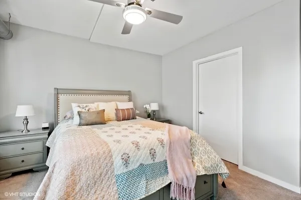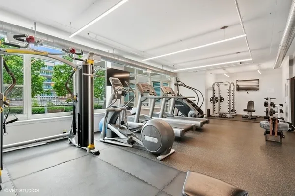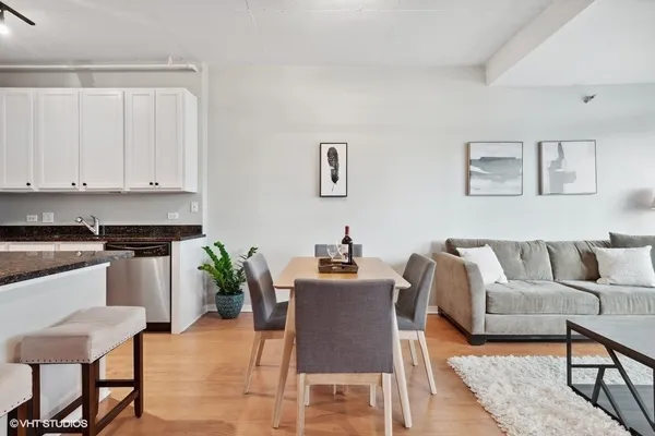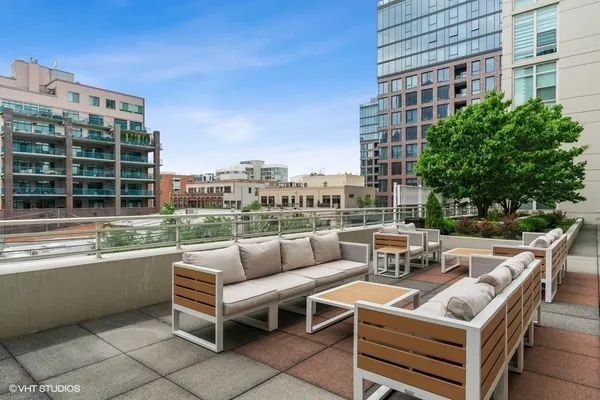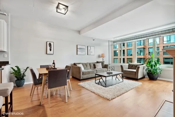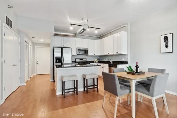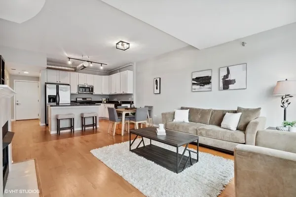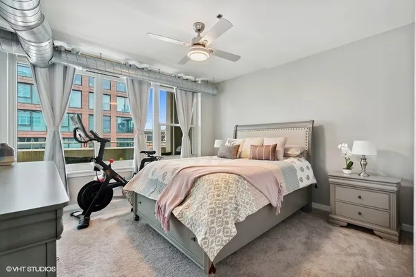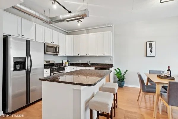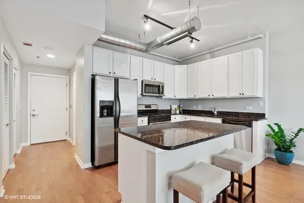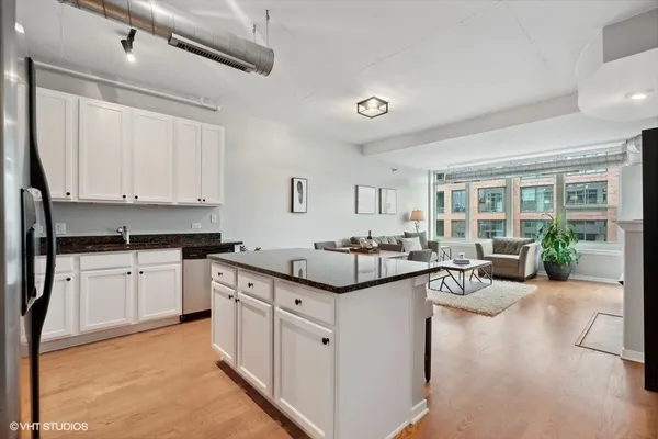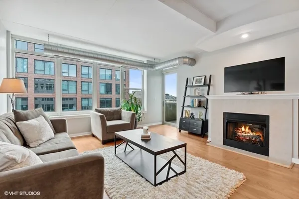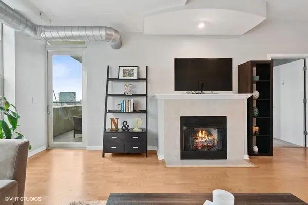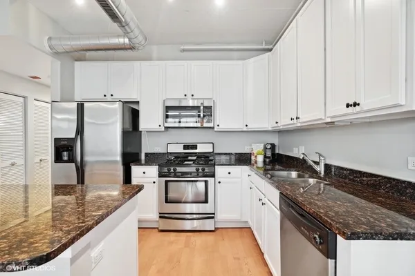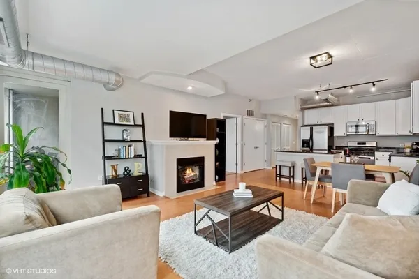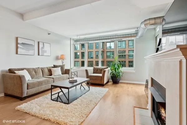 STUNNING, high floor light-filled one bedroom oasis in HEART of West Loop! This West facing LARGE 1 bedroom features an open kitchen/living room/dining room, 9' ceilings with exposed ductwork, hardwood floors, massive windows for natural light, private balcony with views of the city and in unit W/D. This home offers an expansive kitchen with desirable beautiful white cabinetry, an island/breakfast bar, granite countertops and stainless steel appliances. Living space has a gas fireplace and easily accommodates both a living and dining area with access to the balcony, perfect for entertaining. Massive bedroom with a HUGE walk-in closet and custom built-ins. Luxurious spa-like bathroom and generous hall closet with lots of storage space. A premiere building with a 24 hour doorman, exercise facilities, Sundeck, storage room and dog friendly. INCREDIBLE location!! Steps away from Mariano's, Whole Foods, Mary Bartelme Park, World-Class restaurants, bars, nightlife, shopping and with close proximity to the I-90, I-290, CTA Green Line, multiple bus lines, major employers. Deeded Parking available for $35k.