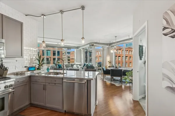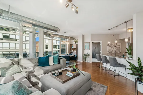 Beautifully updated 2 bed/2 bath CORNER UNIT in a prime location in the heart of the HOT West Loop! This home delivers the perfect open concept layout - living room, dining room, and kitchen flowing seamlessly together, plus oversized windows, an abundance of natural light, and a private balcony that allows you to take in the vibrant energy of the neighborhood. The updated kitchen is a showstopper with designer touches throughout, featuring beautiful cabinetry, an oversized breakfast bar, plus all-new Thermador stainless-steel appliances (2022) and an added wine fridge/beverage center that's perfect for entertaining. The open living space is anchored by a fireplace and custom built-ins, creating a warm, elevated vibe day or night. The exceptionally large primary suite offers a walk-in closet upgraded with a California Closets system, and an ensuite bathroom complete with dual vanity, quartz counters, and a walk-in shower. The second bedroom is thoughtfully outfitted with a custom built-in desk and Murphy bed, making it an ideal guest room/home office/flex space. Enjoy true move-in-ready convenience with in-unit laundry (new washer/dryer 2024), WiFi-enabled smart shades throughout, and new HVAC (2022). Amenities include door staff, fitness center, and a huge terrace perfect for summer hangs. The location is unbeatable, with Randolph Street Restaurant Row, Fulton Market, Mary Bartelme Park with farmer's market, Soho House, Whole Foods, Mariano's, and other amenities just steps away. Skinner school district. Included in the price is a storage locker, a prime parking space conveniently located near the elevator is available for $20k. Welcome home!